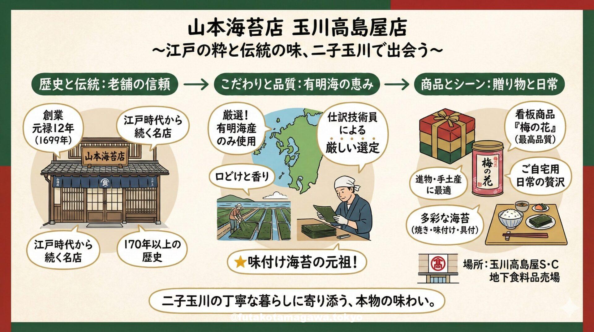 写真 ひとこと紹介文 元禄12年創業、海苔ひと筋の老舗「山本海苔店」。玉川高島屋店では、厳選された有明海産の香り豊かな海苔を取り揃えています。進物からご自宅用まで、日本の伝統が息づく本物の味わいをお届け。二子玉川で上質な手土産を探すなら外せない名店です。 地図 AI紹介文(Gemini3編) 二子玉川で出会う、江戸の粋と伝統の味「山本海苔店」 多摩川の自然と洗練されたショッピングエリアが共存する二子玉川。その中心地である「玉川高島屋S・C」の内に、170年以上の歴史を誇る海苔の専門店「山本海苔店」がありま ...