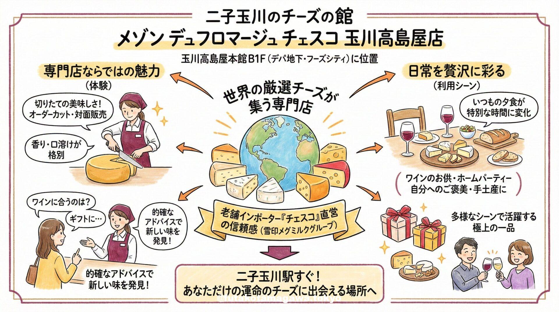 写真 ひとこと紹介文 二子玉川駅徒歩3分、玉川高島屋本館B1F「メゾン デュ フロマージュ チェスコ」。世界のチーズを知り尽くした老舗輸入商社直営の専門店です。プロが厳選した切りたてチーズは、ワインのお供やギフトに最適。食卓を豊かに彩る運命の一品に出会えます。 地図 AI紹介文(Gemini3編) 【二子玉川】世界のチーズが集う「メゾン デュ フロマージュ チェスコ」で、日常に美味しい彩りを 二子玉川駅を降りてすぐ、洗練されたショップが立ち並ぶ玉川高島屋S.C。美食が集まる本館地下1階「フーズシティ」の一 ...