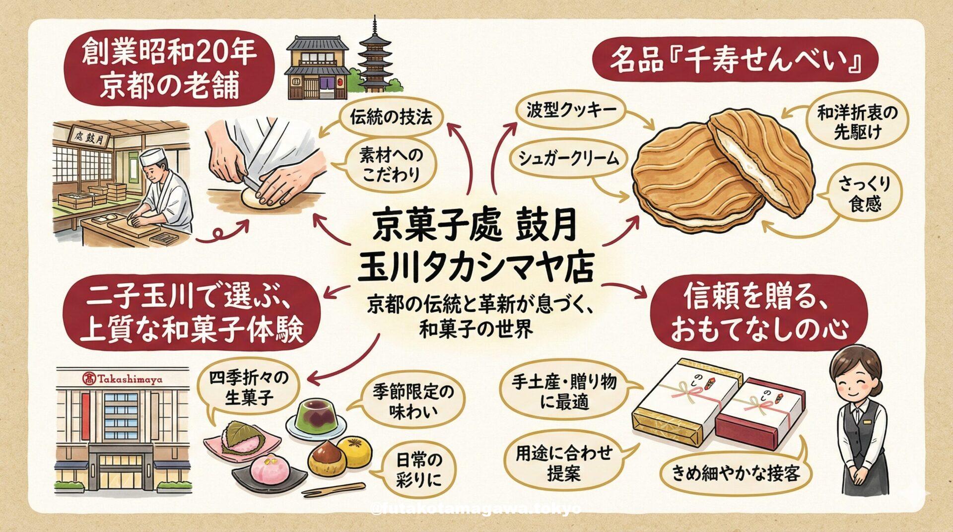 写真 ひとこと紹介文 1945年創業、京都の伝統と革新が息づく「京菓子處 鼓月」。看板商品の「千寿せんべい」をはじめ、四季折々の美しい和菓子が揃います。玉川タカシマヤ店では、大切な方への手土産や自分へのご褒美にぴったりの、心ほどける上質な逸品が見つかります。 地図 AI紹介文(Gemini3編) 二子玉川で出会う、京都の伝統とモダン。 「京菓子處 鼓月」が届ける、進化し続ける和菓子のカタチ。 洗練されたショップが立ち並ぶ二子玉川。その中心地である玉川タカシマヤ本館B1Fに店を構えるのが、京都に本店を置く老 ...