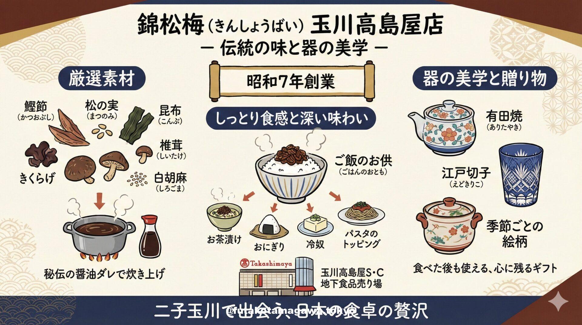写真 ひとこと紹介文 食通に愛され続ける「錦松梅」。鰹節や松の実など厳選素材を使ったしっとり食感のふりかけは、ご飯のお供に最適です。有田焼の器に入った商品は贈り物としても一級品。玉川高島屋店で、時代を超えて愛される伝統の味との出会いを。 地図 AI紹介文(Gemini3編) 日本の食卓を彩る、唯一無二の味わい「錦松梅」 二子玉川駅を降り、玉川高島屋の地下食品売り場へと足を運ぶと、どこか懐かしく、そして凛とした空気を纏う一角があります。それが、昭和の創業以来、多くの食通たちを唸らせてきた「錦松梅(きんしょう ...