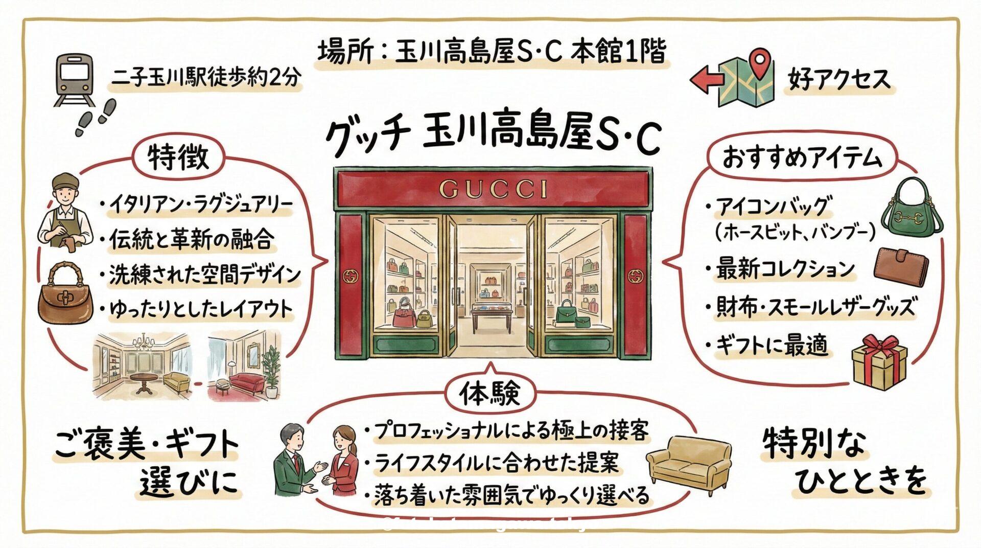 写真 ひとこと紹介文 二子玉川駅すぐ、玉川高島屋S・C本館1階に位置する「グッチ」。イタリアのクラフツマンシップが息づくバッグや財布、シューズなど、洗練されたアイテムが揃います。ご自身へのご褒美や大切なギフト選びに、上質な空間で特別なひとときを。 地図 AI紹介文(Gemini3編) 【二子玉川】グッチ 玉川高島屋S・Cで出会う、イタリアン・ラグジュアリーの真髄 多摩川の豊かな自然と、洗練された都市の魅力が調和する街、二子玉川。その中心的存在である「玉川高島屋S・C」の本館1階に、イタリアを代表するラグジ ...