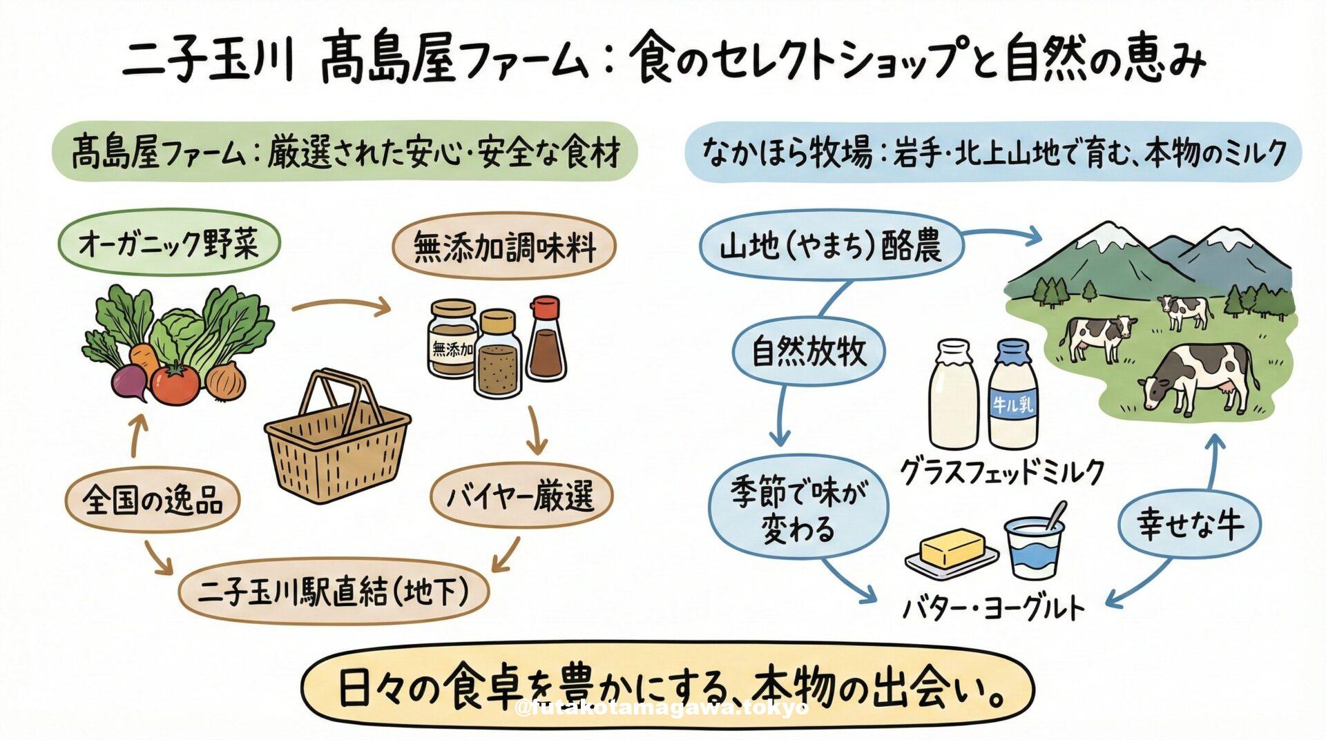 写真 ひとこと紹介文 二子玉川の髙島屋ファームは、オーガニックや無添加にこだわる食のセレクトショップ。なかほら牧場のグラスフェッドミルクなど、生産者の顔が見える「本物の美味しさ」に出会えます。日々の食卓を豊かにする、安心と美食の逸品を探しに行きませんか? 地図 AI紹介文(Gemini3編) 【二子玉川】食卓が変わる!髙島屋ファームで出会う「本物の自然」となかほら牧場の奇跡 二子玉川駅直結、玉川髙島屋S.C.の地下に広がる「髙島屋ファーム 玉川店」。ここは単なる食品売り場ではありません。足を踏み入れた瞬間 ...