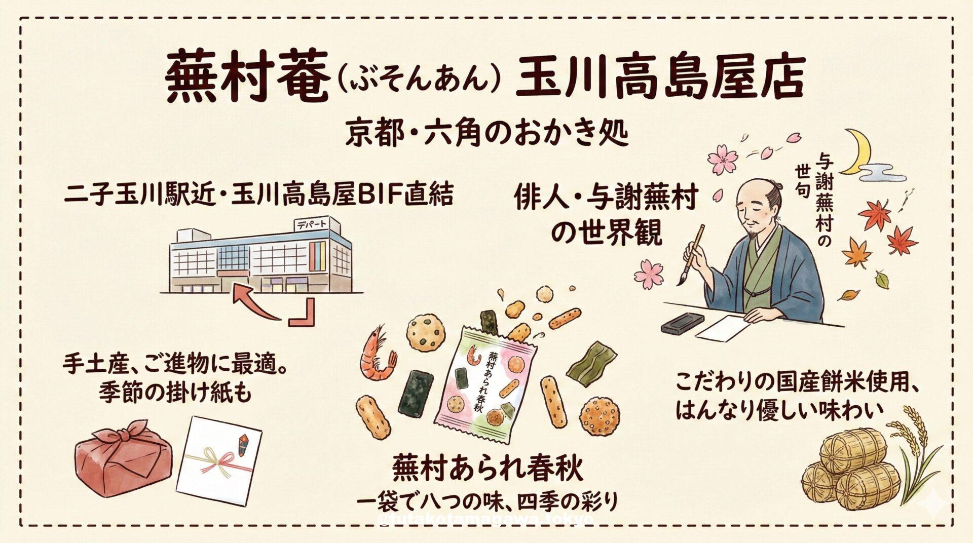 写真 ひとこと紹介文 二子玉川で京都の風情を感じるなら「蕪村菴」へ。俳人・与謝蕪村の句に想いを馳せた、繊細で美しいおかき・お煎餅は手土産に最適。四季折々の味わいと上品なパッケージが、大切な方への心を伝えます。玉川高島屋B1Fで出会う、雅なひとときを。 地図 AI紹介文(Gemini3編) 【二子玉川】京都の雅を手土産に。おかき処「蕪村菴」で選ぶ、心伝わる和のギフト 二子玉川駅すぐ、玉川高島屋S・Cの本館地下一階。数多くの名店がひしめくデパ地下の一角に、ふわりと京都の風を運んでくれるお店があります。それが、 ...