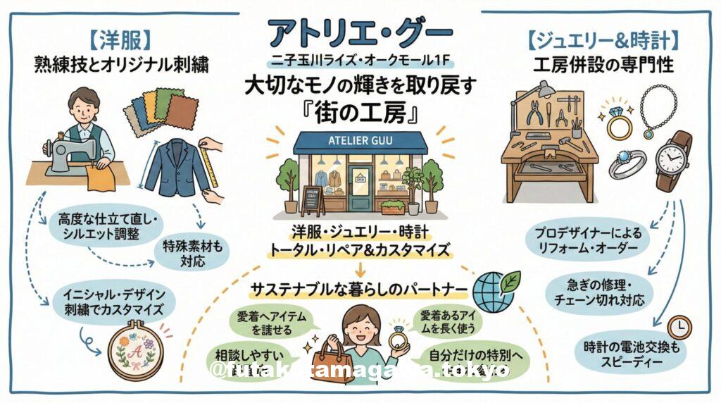 二子玉川ライズ・オークモール1Fの「アトリエ・グー」は、洋服とジュエリーの工房一体型ショップ。熟練職人による洋服直しや刺繍カスタマイズに加え、プロのデザイナーによるジュエリーのリフォーム・オーダーも可能。時計の電池交換や急ぎの修理にも対応する、頼れる街の工房です。