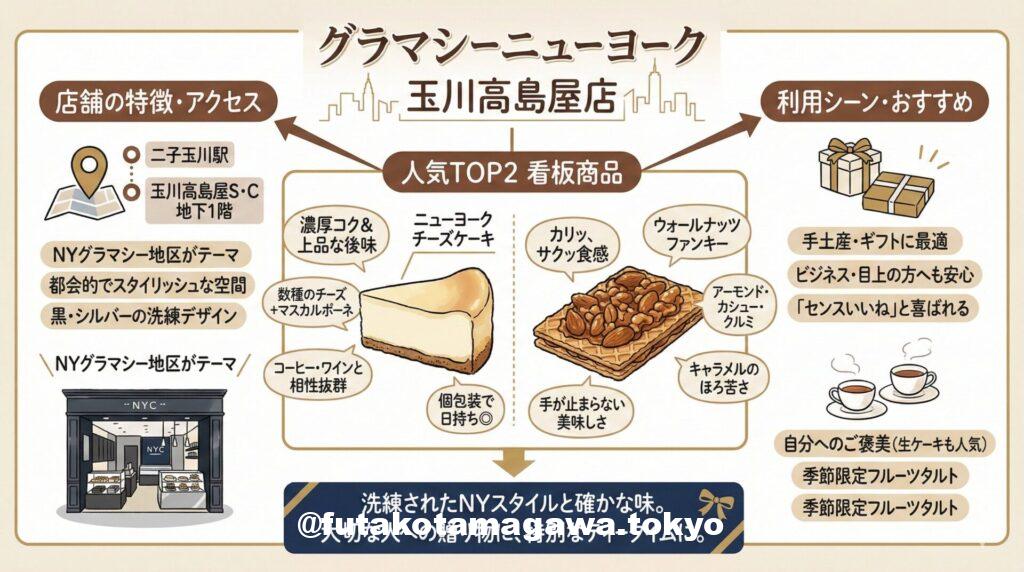 | フリーキーワード | 二子玉川駅すぐ、玉川高島屋S・C地下にある「グラマシーニューヨーク」。NYの文化と歴史を感じさせるスタイリッシュなスイーツブランドです。看板商品の濃厚な「ニューヨークチーズケーキ」や、ナッツの食感が楽しい「ウォールナッツファンキー」は、手土産の鉄板。洗練されたパッケージと確かな味わいは、大切な人へのギフトや自分へのご褒美に最適です。都会的で上質なスイーツライフを提案してくれます。 |