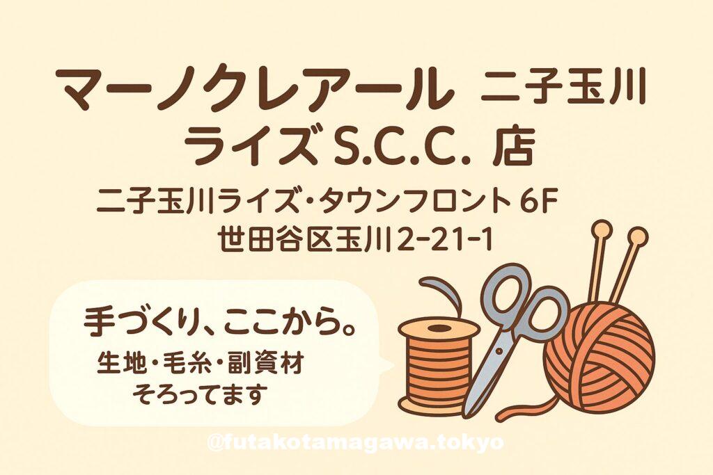 | フリーキーワード | 二子玉川ライズ6F「マーノクレアール」。生地・毛糸・リボン・ボタン・副資材、ソーイング&編み物用品が勢ぞろい。トレンドのブランド生地や季節のポップアップも魅力で、初心者の小物づくりから大人の本格服まで対応。営業時間10:00–20:00。買い物や映画の前後、ひらめいたその日に“作りたい”を形に。 |
