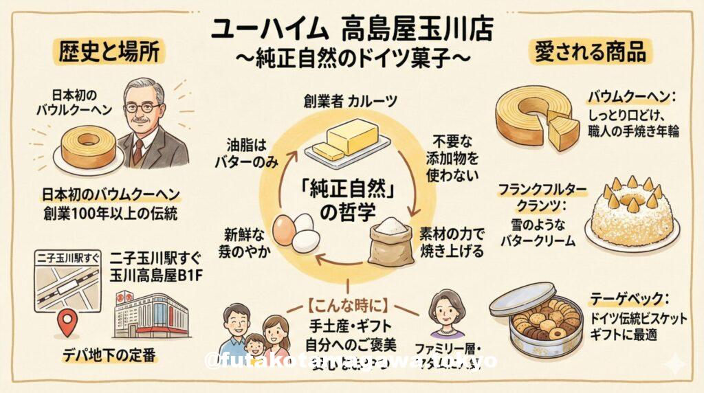 流行のスイーツも素敵ですが、時には時代を超えて愛される「本物」の味に触れてみてはいかがでしょうか。小さなお子様からご年配の方まで、誰もが安心して笑顔になれるユーハイムのスイーツ。玉川高島屋にお越しの際は、ぜひその変わらぬ美味しさを連れて帰ってください。