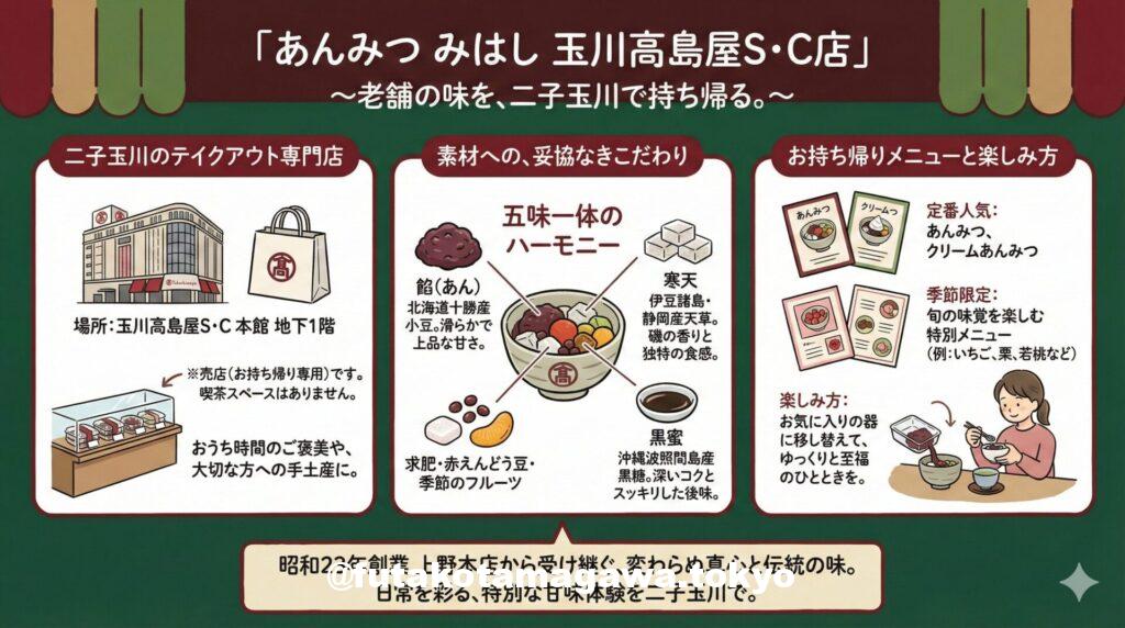 多摩川の豊かな自然と洗練された都市機能が調和する街、二子玉川。そのランドマークである「玉川高島屋S・C」本館地下一階のフーズシティ内に、昭和23年創業の老舗「あんみつ みはし」があります。