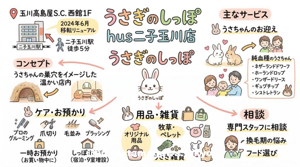 | フリーキーワード | 「うさぎのしっぽ hus二子玉川店」は、玉川高島屋S.C西館1Fにある本格うさぎ専門店です。ガーデンアイランドから移転し「うさぎの巣穴」をモチーフにした癒やしの店舗へリニューアル!愛らしい純血種のうさぎたちや高品質な専門グッズが勢揃いしています。プロによる丁寧なグルーミングや、お買い物の合間に便利な一時預かり、9室に増設された「しっぽホテル」まで完備。愛兎との生活をトータルサポートしてくれます! |