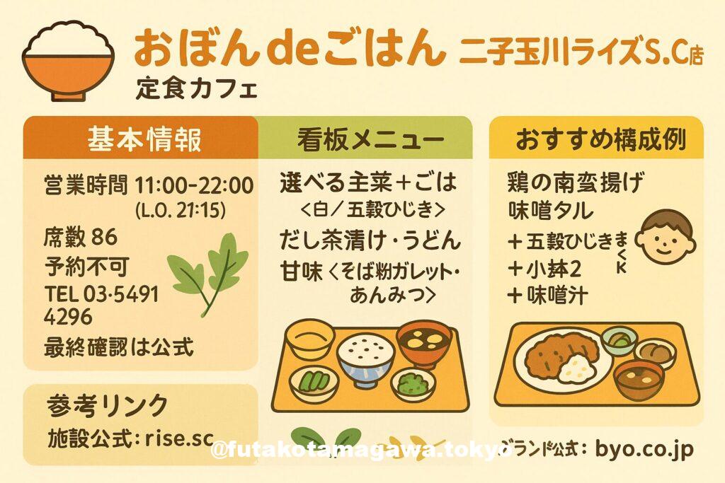 フリーキーワード | 二子玉川,おぼんdeごはん,タウンフロント7F,定食カフェ,手作り,野菜たっぷり,選べる主菜,白ごはん,五穀ひじきごはん,だし茶漬け,うどん,そば粉ガレット,あんみつ,チャイルドシート,ベビーカーOK,テイクアウト可,席数86,11:00–22:00,駅直結,日常ごはん,ヘルシー,和食ランチ,家族連れ,一人ごはん,二子玉川ライズ,田園都市線グルメ。 |