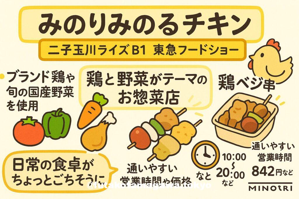 SEOを意識したキーワードとしては「みのりみのるチキン」「鶏ベジ串」「チキンデリ」「二子玉川 ライズ 惣菜」「東急フードショー チキン」が自然に効くよう構成しました。