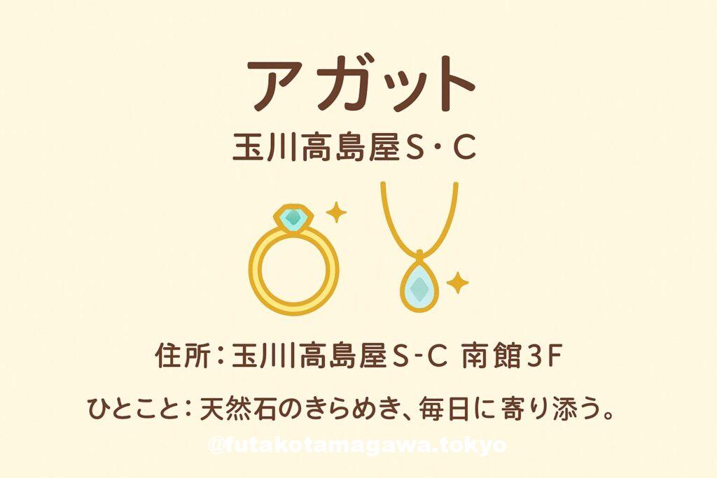| フリーキーワード | 玉川高島屋S・C南館3F「アガット」は、天然石の個性と地金の上質感をいかしたジュエリーが揃う二子玉川の定番。リング・ネックレス・ピアス・イヤーカフまで幅広く、ギフト相談もしやすい。最新作は公式とSNSで確認し、店頭で石色やサイズ感を比較して“自分らしい一本”に出会えます。 |