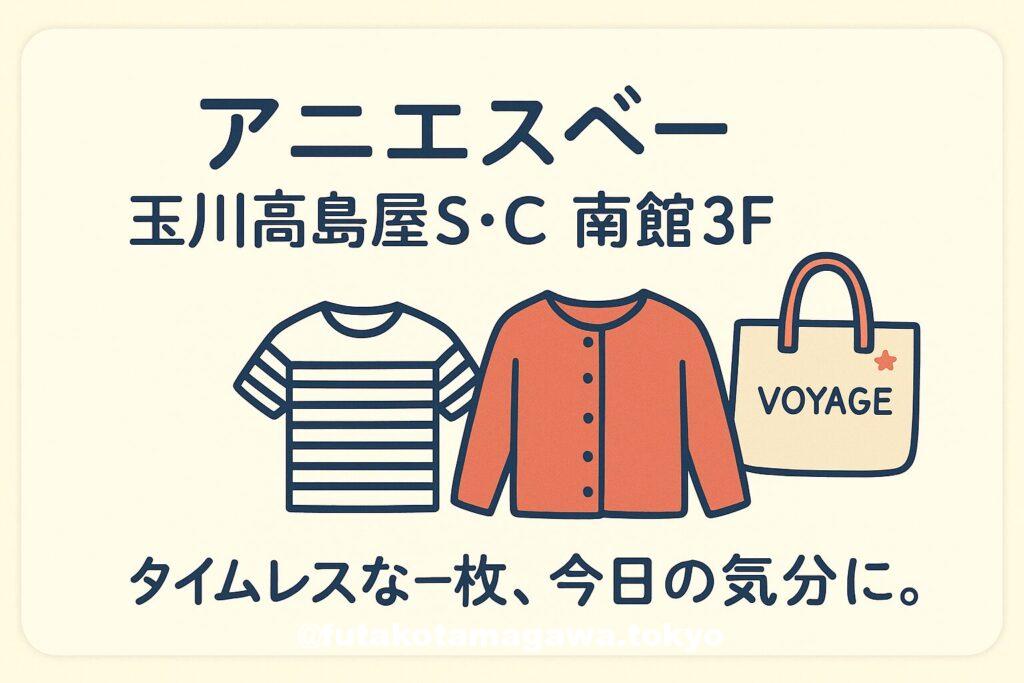 二子玉川駅からすぐの玉川高島屋S・C南館3F「アニエスベー」は、世代と性別を超えて愛されるベーシックを軸に、季節のムードを軽やかに乗せたコレクションを展開しています。