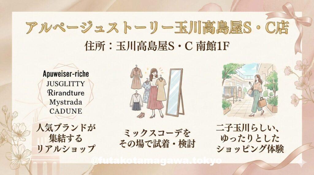 アルページュストーリーといえば、雑誌掲載常連の人気ブランドを公式に取り扱うファッション通販サイトとして有名ですが、玉川高島屋S・C店はその世界観を肌で感じられる**「リアルショップ(セレクトショップ)」**です。