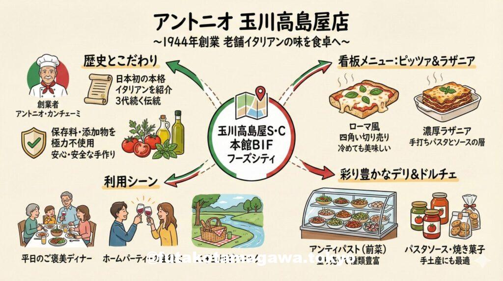 二子玉川を訪れた際は、ぜひ地下1階の「アントニオ」へ足を運んでみてください。名店の歴史と誇りが詰まった一品が、あなたの食卓を素敵に演出してくれるはずです。は「本当に美味しいイタリアンが食べたい」と思った時に。歴史に裏打ちされた安心感と、時代を超えて愛される極上の味を、ぜひ五感で体験してください。
