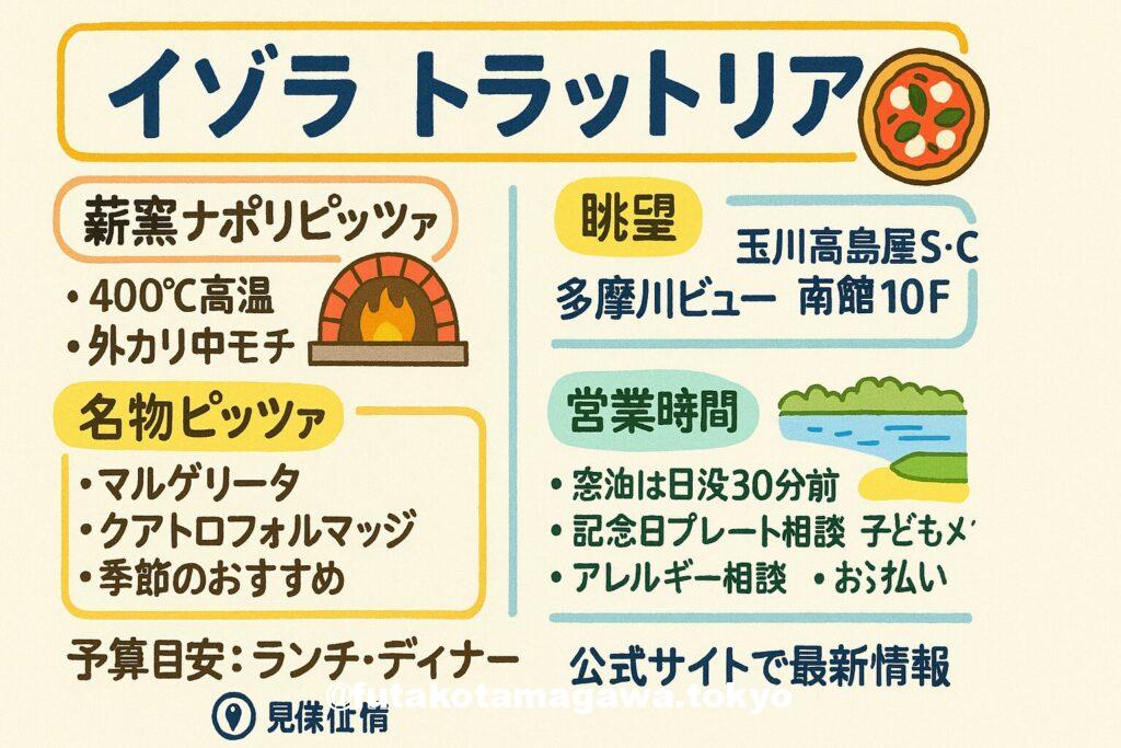 フリーキーワード玉川高島屋S・C南館10Fの「イゾラ トラットリア」は、薪窯で焼く本場ナポリピッツァと季節素材の一皿が評判。窓側席から多摩川を望み、家族や記念日にちょうどいい上質感。ランチ11:00〜15:30、ディナー17:30〜22:00。王道のマルゲリータから季節ピッツァ、黒毛和牛メインのコースまで、“二子玉川の日常を少しだけ特別にする”信頼の一軒。