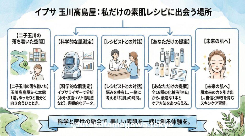 二子玉川にお越しの際は、ぜひイプサ 玉川高島屋へ足を運んでみてください。 プロフェッショナルなレシピストと共に作る「あなただけのレシピ」が、明日からの肌と心に、自信と輝きを与えてくれるはずです。
