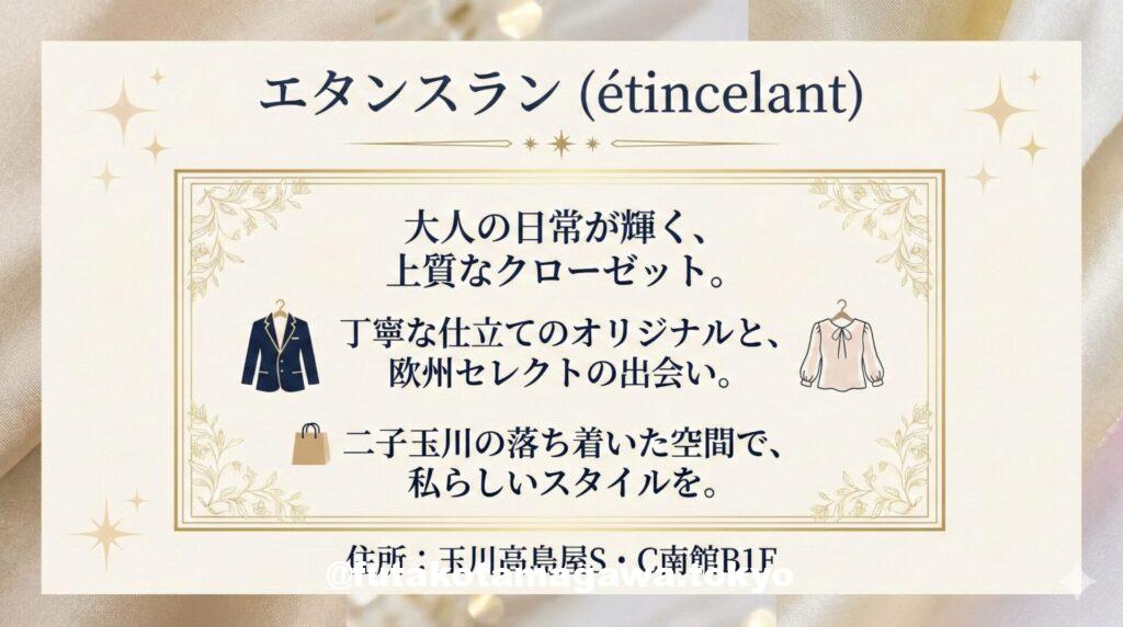 | フリーキーワード | 【大人の日常着に、品とときめきを】 「エタンスラン(étincelant)」は、フランス語で「輝く」を意味する、二子玉川の大人のためのクローゼット。玉川高島屋S・C南館B1Fに位置し、ウェルベック社が手がける確かな縫製のオリジナルウェアと、欧州などから選び抜かれたインポートアイテムが融合。ベーシックなのにどこか新しい、袖を通すだけで背筋が伸びるような「上質な日常着」に出会えるセレクトショップです。 |