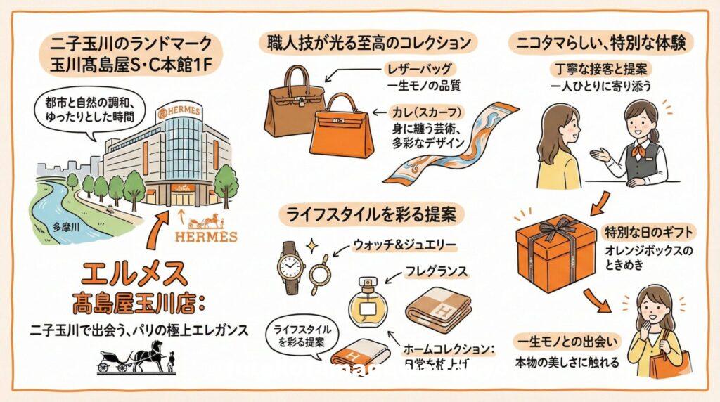 多摩川の豊かな自然と、都会的な洗練さが美しく調和する街、二子玉川。 「ニコタマ」の愛称で親しまれ、感度の高い大人たちが集うこの街のランドマークといえば、やはり「玉川髙島屋S・C」です。その本館1階、一際優雅な空気を纏ってゲストを迎えるのが**「エルメス 髙島屋玉川店」**です。