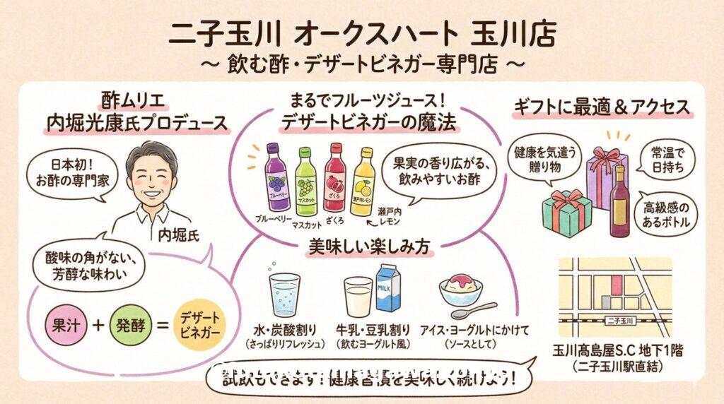 | フリーキーワード | 「酸っぱい」を「美味しい」に変える魔法のお店。 二子玉川の地下に広がる「オークスハート」は、酢ムリエ・内堀光康氏が手掛けるデザートビネガーの聖地です。果実の甘みと香りを閉じ込めた「飲むお酢」は、水や牛乳で割るだけで極上のドリンクに早変わり。毎日の健康習慣にはもちろん、大切な人の体を想う「センスの良いギフト」としても選ばれています。お酢の概念が覆る感動体験を、ぜひあなたも。 |