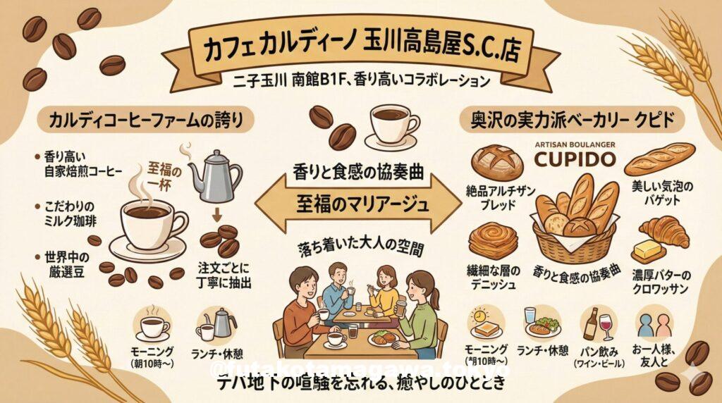 二子玉川の駅を降り、多摩川の風を感じながら玉川高島屋S.C.へ。ショッピングで賑わうこの場所の南館地下1階に、ふと足を止めたくなる香ばしい香りが漂っています。そこにあるのは、輸入食品でお馴染みのカルディコーヒーファームが手掛ける「カフェカルディーノ 玉川高島屋S.C.店」。