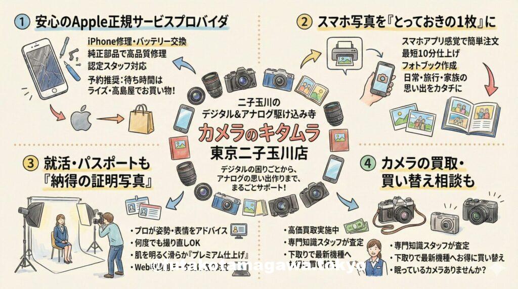 まとめ Apple製品のトラブル解決から、思い出を美しく残すプリントサービスまで。 「カメラのキタムラ 東京二子玉川店」は、デジタルの利便性とアナログの温かみを兼ね備えた、二子玉川になくてはならないお店です。ぜひ、次のお出かけの際に立ち寄ってみてください。