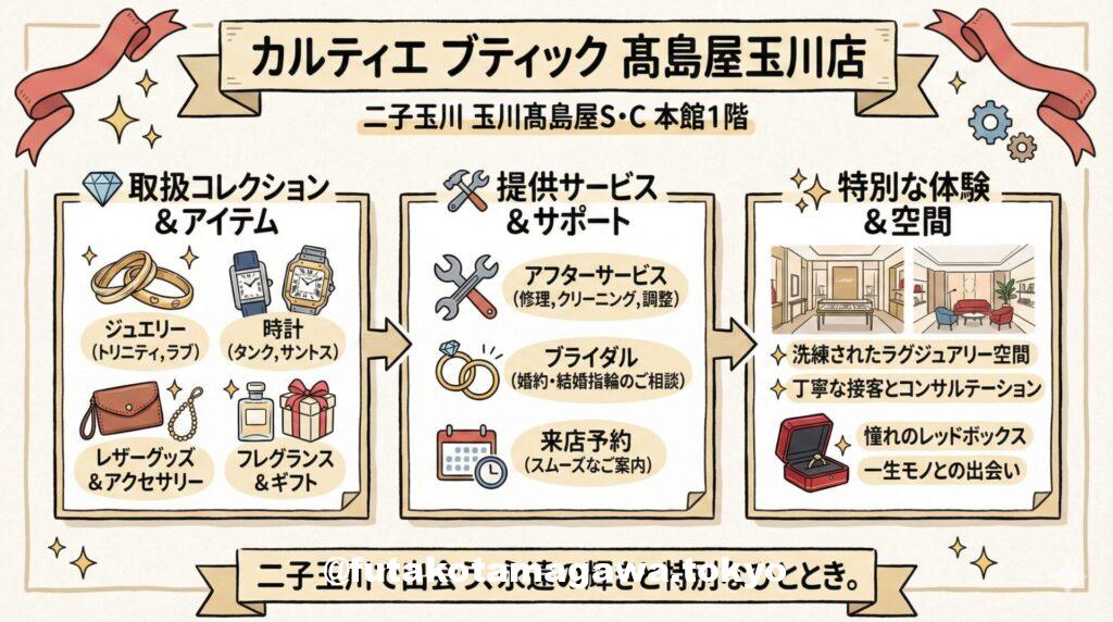 多摩川の豊かな自然と、都市の洗練が調和する街、二子玉川。そのランドマークである玉川髙島屋S・Cの本館1階に、フランスが誇るハイジュエラー「カルティエ(Cartier)」のブティックは静かに、そして力強くその扉を開いています。
