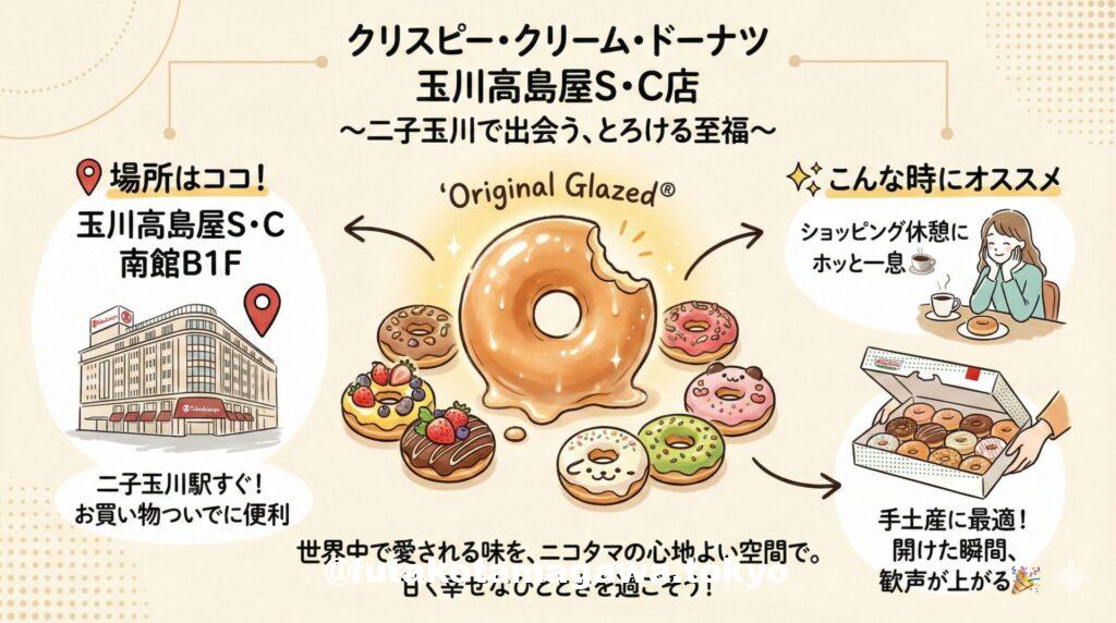 多摩川の自然と洗練されたショッピングエリアが共存する街、二子玉川。そのランドマークである「玉川高島屋S・C」の南館地下1階に、甘い香りで道行く人を誘う場所があります。それが**「クリスピー・クリーム・ドーナツ 玉川高島屋S・C店」**です。