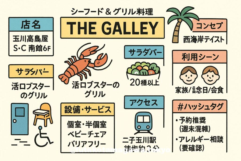 フリーキーワード二子玉川の海気分を運ぶ「THE GALLEY」。活ロブスターやステーキなど豪快グリルに、20種超のサラダバーを好きなだけ。玉川高島屋S・C直結、個室・半個室も備え、家族ランチから記念日まで幅広く活躍。西海岸の開放感、香ばしい火入れ、彩り豊かな野菜で、二子玉川の“おいしい寄港地”になる一軒です。
