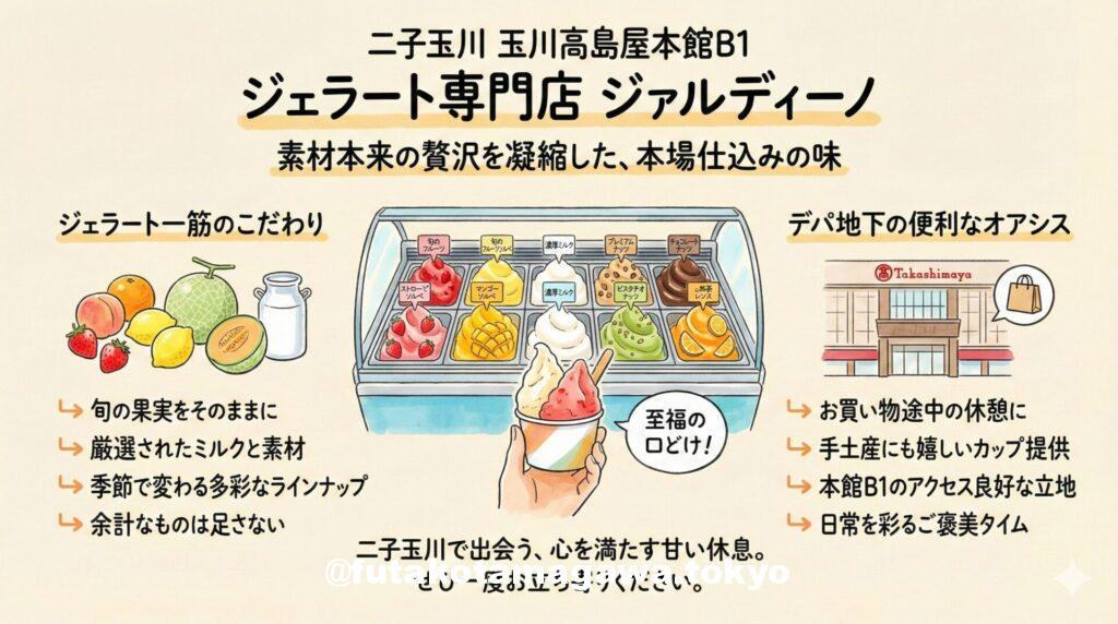 ショッピングや散策の街として人気の高い二子玉川。そのランドマークともいえる玉川高島屋本館B1に、スイーツ好きの間で密かに話題を集めている場所があります。それが、ジェラート専門店「ジァルディーノ(Giardino)」です。