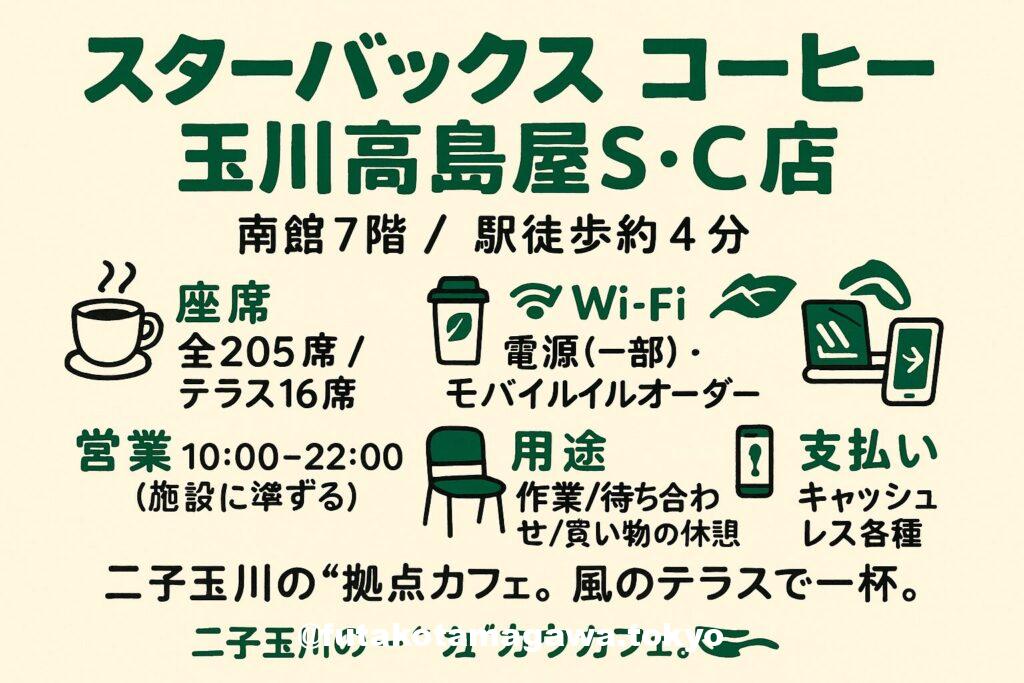 フリーキーワード | 二子玉川・玉川髙島屋S・C南館7階の「スターバックス」。全205席・テラス16席でゆったり、Wi-Fiとモバイルオーダー対応で快適。駅から徒歩約4分、10:00~22:00営業。買い物の合間の休憩、作業、待ち合わせまで“二子玉川の拠点カフェ”として覚えておきたい一店。 |