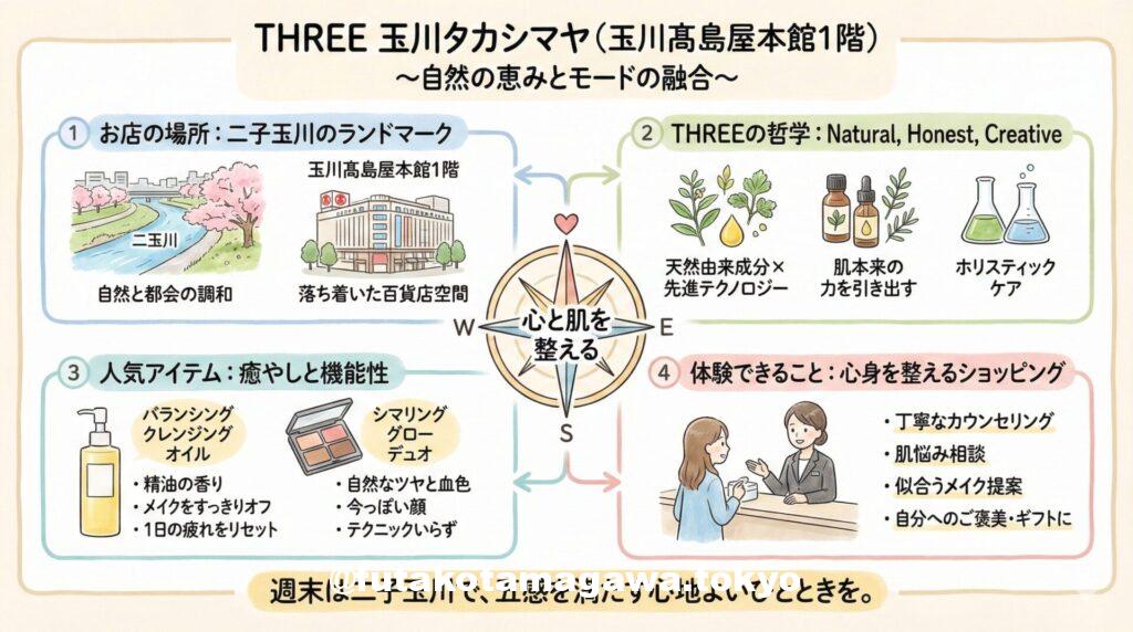 多摩川の豊かな自然と、都会的な洗練さが調和する街、二子玉川。その中心的存在である玉川髙島屋の本館1階に、コスメブランド**「THREE(スリー)」**のカウンターがあります。