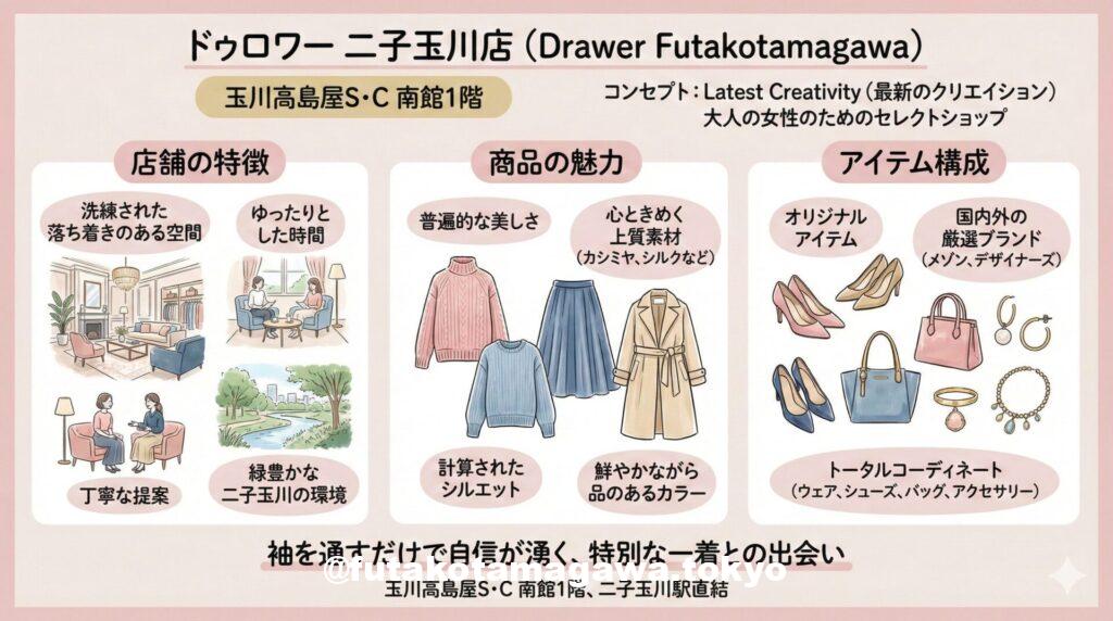 二子玉川駅を降りてすぐ、豊かな緑と都市の利便性が調和する玉川高島屋S・C。その南館1階に、ファッション感度の高い大人の女性たちが信頼を寄せる場所があります。それが「ドゥロワー(Drawer)二子玉川店」です。