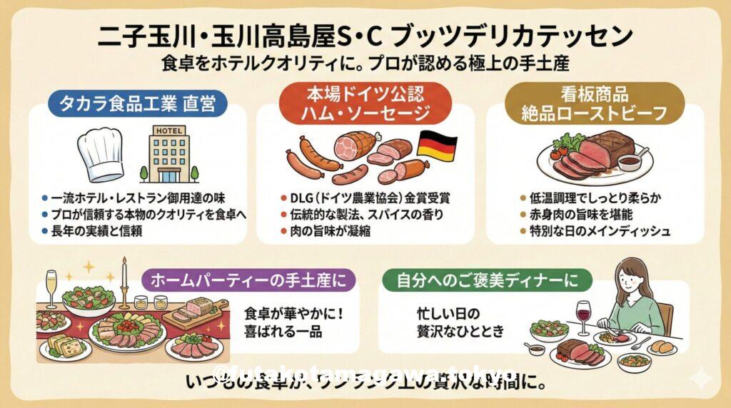 | フリーキーワード | 二子玉川の美食家たちが信頼を寄せる、玉川高島屋の隠れた名店。有名ホテルやレストランに製品を卸す「タカラ食品工業」直営のデリカテッセンです。本場ドイツのコンテストで金賞を受賞したハム・ソーセージは、肉の旨味が凝縮された本格派。特に、しっとりと柔らかなローストビーフは、記念日の食卓を華やかに彩る逸品です。ワインのお供や、自分へのご褒美に。プロの味を気軽にテイクアウトできる、頼れる一軒です。 |