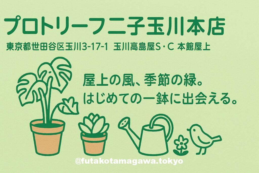 フリーキーワード玉川髙島屋S・C本館屋上のプロトリーフ二子玉川本店は、観葉・多肉・希少種まで揃う都内屈指の園芸店。用土や鉢も豊富で、植え替えや配送、ワークショップも対応。公式SNSとYouTubeで育て方を学び、店頭で相談しながら“我が家に合う一鉢”に出会える、二子玉川の定番グリーンスポット。