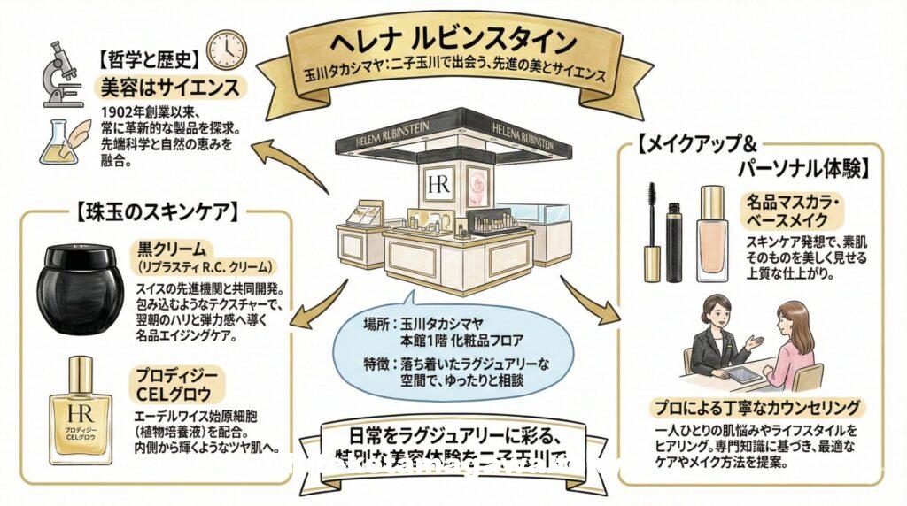 まとめ 「ヘレナ ルビンスタイン 玉川タカシマヤ」は、ただ化粧品を買う場所ではなく、美しさを高めるための「特別な体験」ができる場所です。ご自身の肌へのご褒美に、あるいは大切な方へのギフト探しに。洗練された二子玉川へお越しの際は、ぜひヘレナ ルビンスタインのカウンターで、先進の美容サイエンスが生み出す感動を味わってみてはいかがでしょうか。