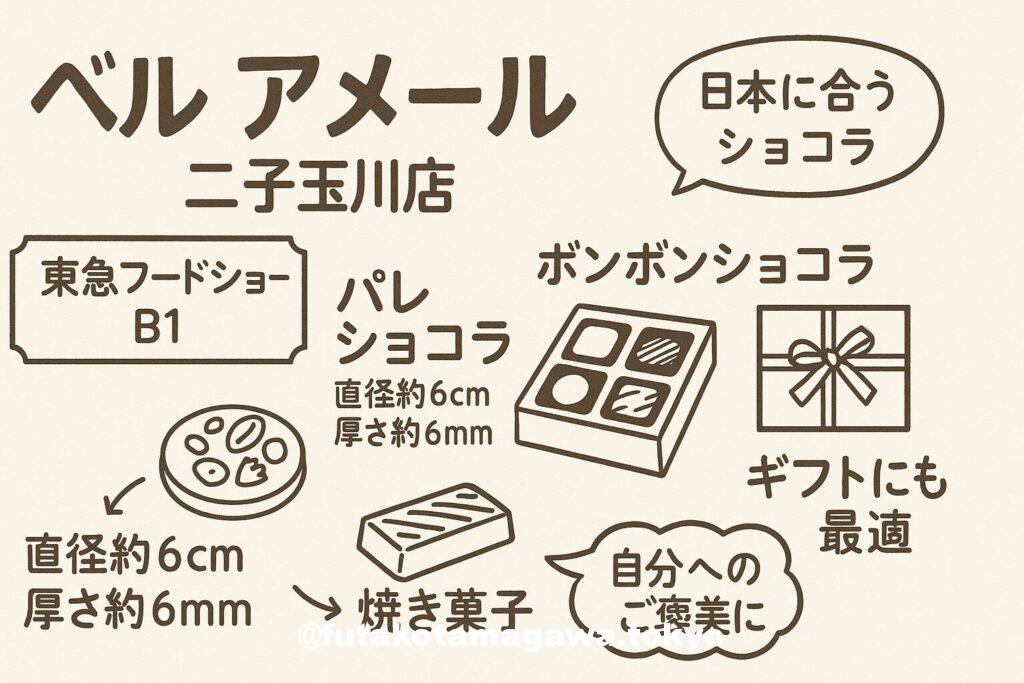 フリーキーワード東急フードショーB1「ベル アメール」は、日本の感性に寄り添うショコラ専門店。看板のパレショコラは直径約6cm・厚さ約6mm、季節限定も含む多彩なバリエが魅力。ボンボンショコラや焼き菓子も揃い、ギフトから自分へのご褒美まで対応。営業時間10:00〜20:00、二子玉川駅直結でアクセス良好。