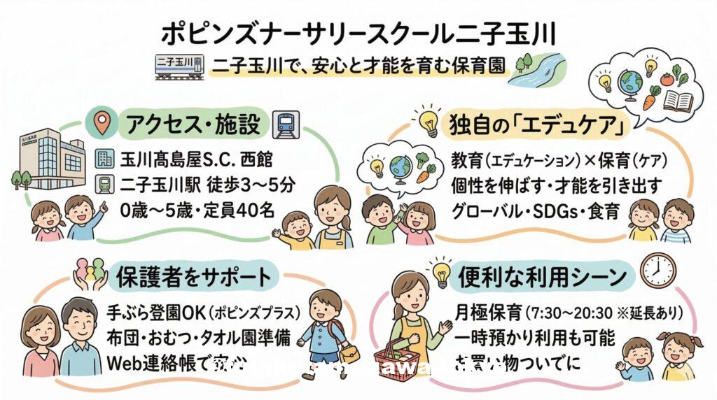 | フリーキーワード | 二子玉川駅徒歩3分、玉川髙島屋S・C西館にある「ポピンズナーサリースクール二子玉川」は、教育と保育を掛け合わせた「エデュケア」を実践する東京都認証保育所です。SDGsや食育を取り入れた質の高いプログラムで子どもの才能を引き出します。おむつや布団が不要になる「手ぶら登園」オプションやITを活用した連絡帳など、働くパパ・ママの負担を減らすサポートも充実。お買い物中の一時預かりにも対応しています。 |