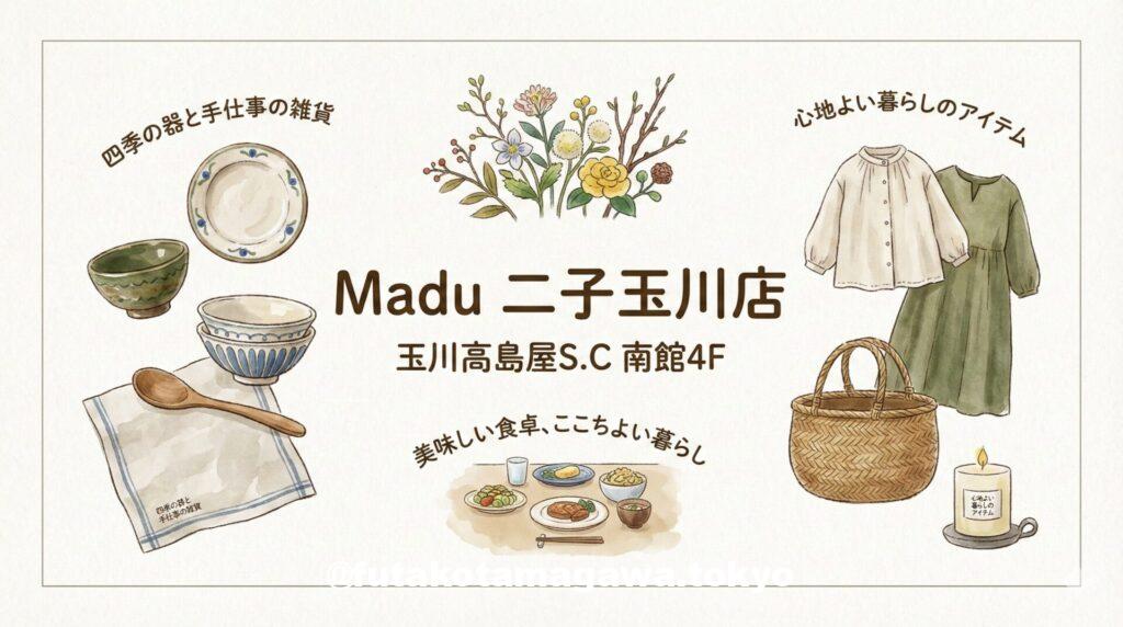 二子玉川駅を降りてすぐ、玉川高島屋S.C南館の4階に、ふと足を止めたくなる素敵なお店があります。それが今回ご紹介する**「Madu(マディ)二子玉川店」**です。