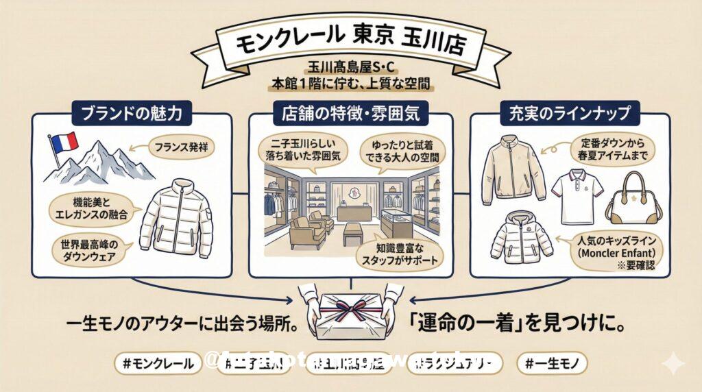 渋谷や銀座の旗艦店のような喧騒とは異なり、玉川髙島屋S・Cという立地柄、ゆったりとした時間の流れの中でショッピングを楽しむことができます。知識豊富なスタッフが、お客様一人ひとりのライフスタイルに合わせた「運命の一着」を丁寧に提案してくれるため、初めてモンクレールを購入する方や、ゆっくり試着をして選びたい方に最適な店舗です。