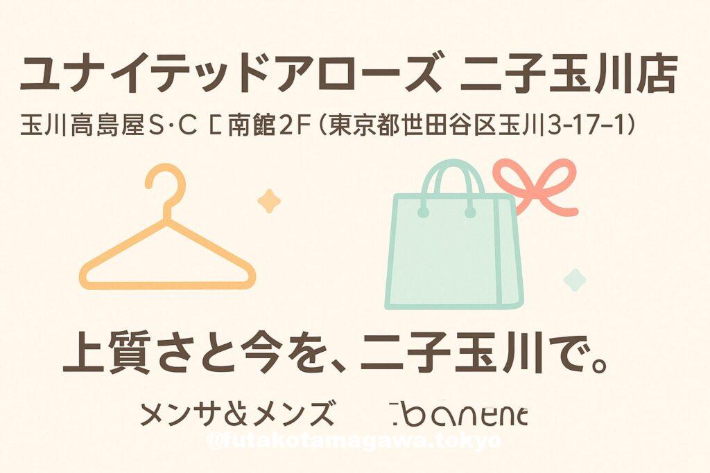 | フリーキーワード | 二子玉川駅近く、玉川高島屋S・C南館2Fの〈ユナイテッドアローズ〉は、上質さと旬のムードを備えた大人のセレクトショップ。メンズ・ウィメンズともに通勤から週末まで活躍する服と小物が揃い、ギフト選びにも最適。館内の買い回りもしやすく、イベントや限定企画も随時開催。営業時間10:00–20:00、TEL 050-8893-1894。 |