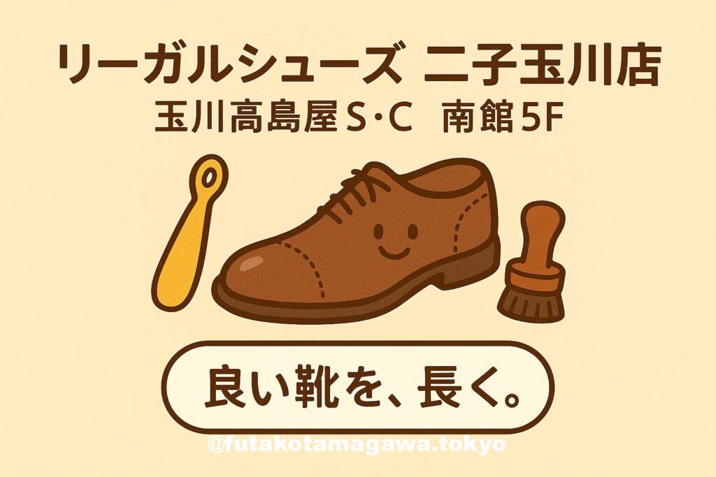 | フリーキーワード | 二子玉川〈リーガルシューズ〉は、南館5Fでメンズ&レディスを展開。ローファーやストレートチップ、歩きやすい〈Regal Walker〉、雨に強いゴアテックスまで揃い、サイズ相談・修理・シューケアも万全。オンライン予約→店頭試着や免税対応で、忙しい日常でも“良い靴を長く履く”を叶えます。 |