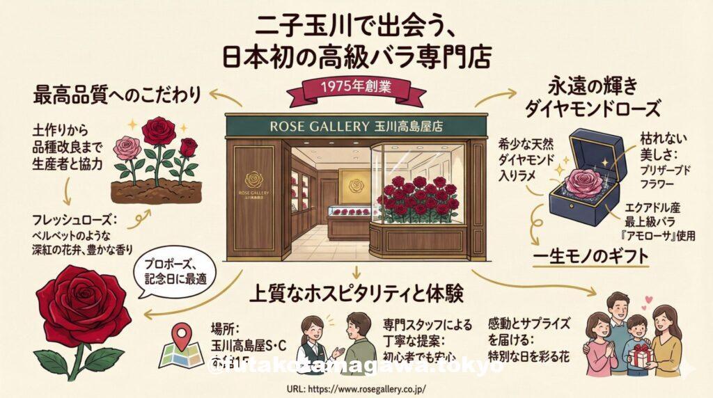モノがあふれる現代だからこそ、記憶に残る「体験」と「美しさ」を贈る価値は高まっています。 二子玉川を訪れた際は、ぜひローズギャラリー玉川高島屋店へ足を運んでみてください。ショーケースに並ぶ宝石のようなバラたちが、あなたの特別な想いを届ける手助けをしてくれるはずです。