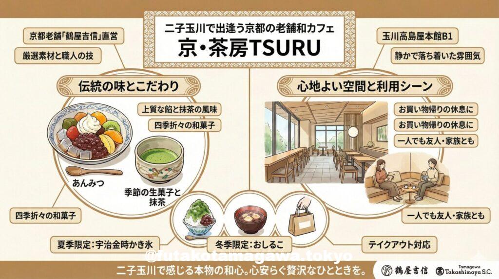 多摩川の自然と洗練されたショップが共存する街、二子玉川。多くの人々で賑わうこの街の喧騒をふと忘れさせてくれる場所が、玉川高島屋S・C南館4階にあります。それが、京都で200年以上の歴史を誇る老舗和菓子店「鶴屋吉信(つるやよしのぶ)」がプロデュースする**「京・茶房TSURU(きょう・さぼう つる)」**です。