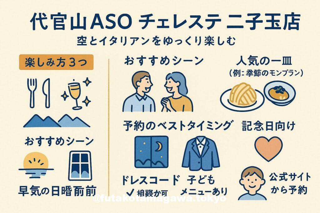 フリーキーワード | 二子玉川の空を切り取る窓辺で、“ASO”の季節感をプリフィクスで味わう。白×紺の清楚な空間、朗らかなサービス、記念日にも日常にも寄り添う一皿。ランチ11:00〜、ディナーは平日18:00〜/土日祝17:30〜。食後は夜景を眺め、余韻まで美味しい。訪問は公式NEWSで最新情報をチェックして計画を。 |