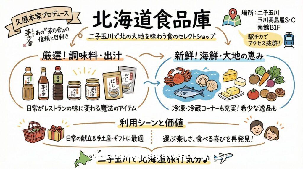 多摩川の自然と洗練された街並みが共存する二子玉川。そのランドマークである「玉川高島屋S・C」南館地階に、食通たちの注目を集めるショップがあります。それが、北海道の厳選された「おいしいもの」が凝縮されたセレクトショップ、**「北海道食品庫」**です。