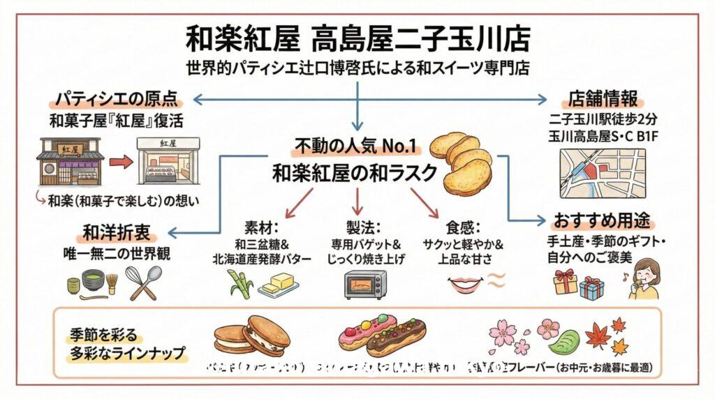 洗練された大人の街、二子玉川。玉川高島屋S・Cのデパ地下に、スイーツ好きなら一度は訪れたい名店があります。それが、世界的パティシエ・辻口博啓氏が手掛ける和スイーツ専門店**「和楽紅屋(わらくべにや) 高島屋二子玉川店」**です。