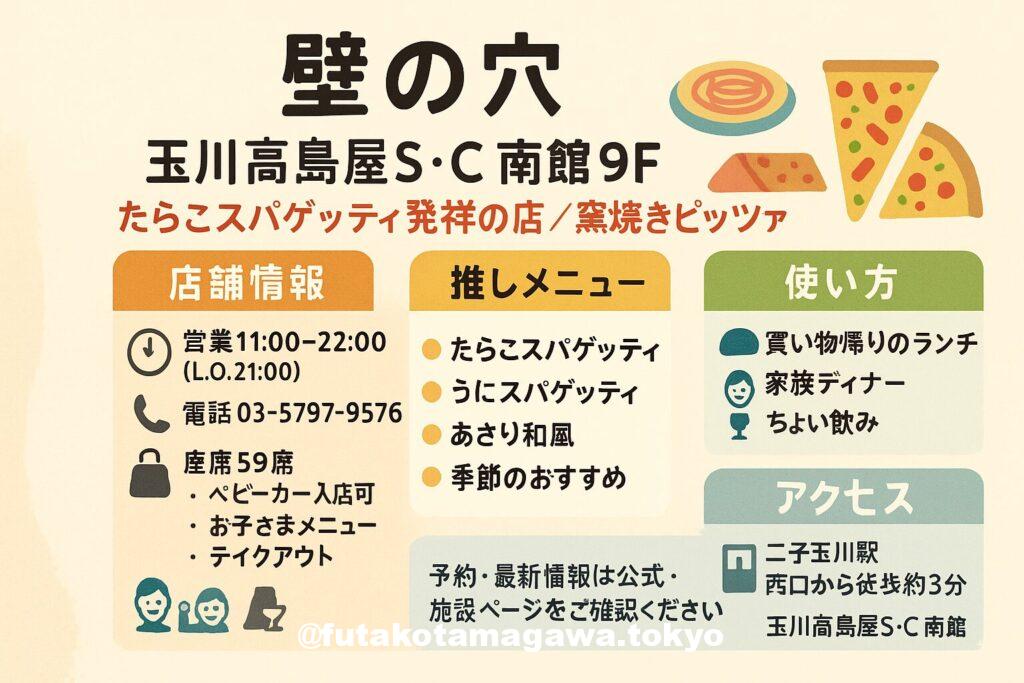 フリーキーワード | 二子玉川/玉川高島屋S・C南館9F/壁の穴/和風パスタ発祥/1953年創業/たらこスパゲッティ/うに・あさり/窯焼きピッツァ/自家製デザート/こだわりコーヒー/家族連れ歓迎/お子さまメニューあり/テイクアウト/59席/11:00–22:00/駅近/買い物帰りのランチ/ディナー/ネット予約/食べログ掲載/電話03-5797-9576—“二子玉”の定番パスタ。 |