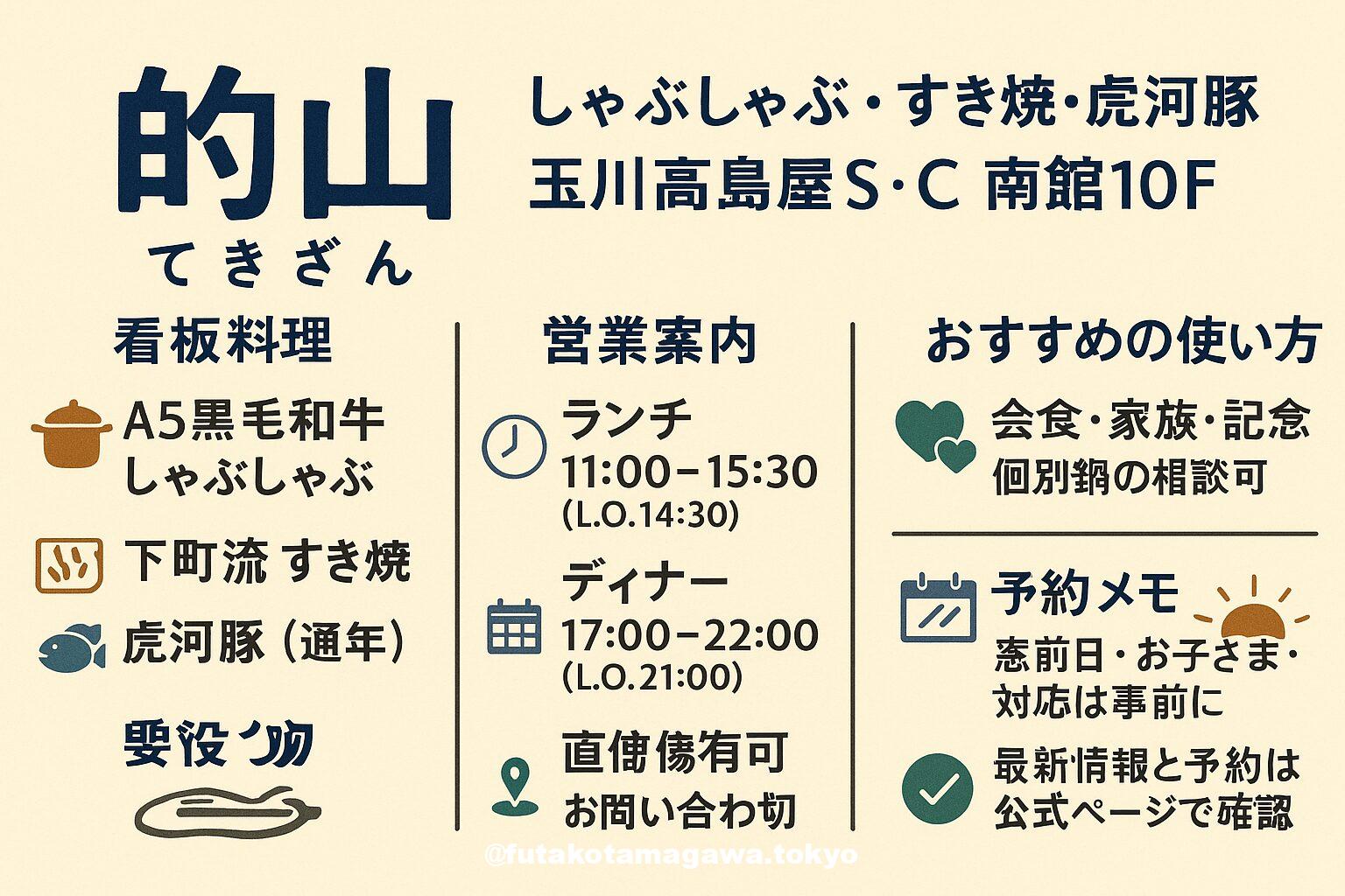 お子さまメニューやベビーカー入店可、テイクアウト対応と、家族での“二子玉ごはん”にも心強い設備が整っています。