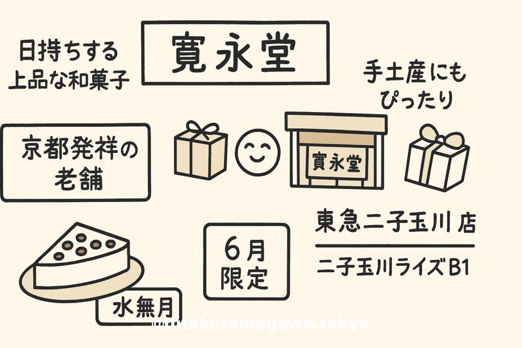 二子玉川ライズ・東急フードショー地下1階にある「寛永堂 東急二子玉川店」は、京都発祥の老舗和菓子店〈寛永堂〉が届ける、こだわりの和菓子専門ショップです。
